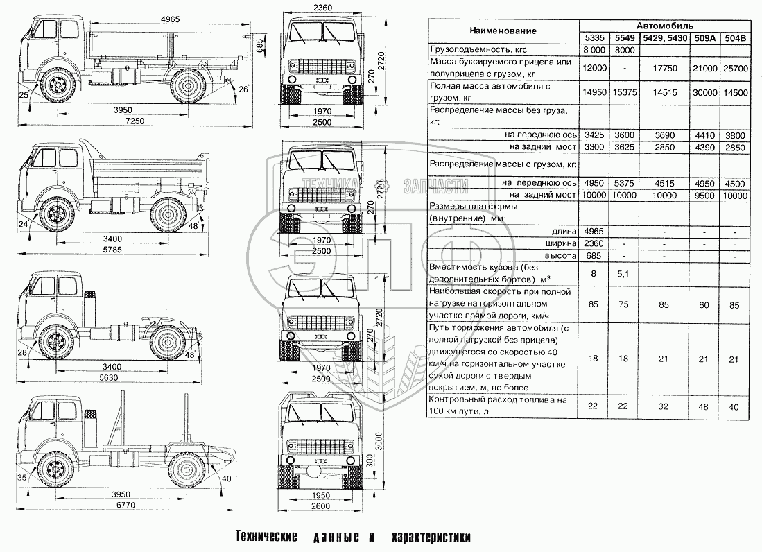 Каталог запасных частей к технике: МАЗ-5549. Габаритные размеры и технические данные