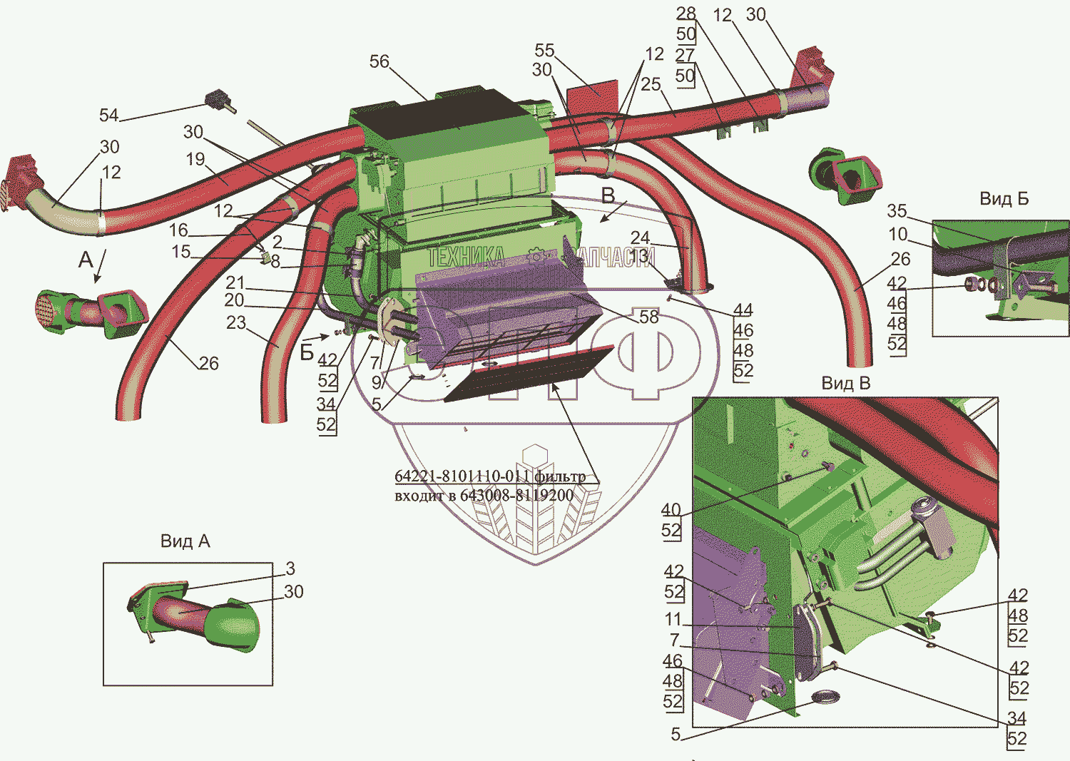 Каталог запасных частей к технике: МАЗ-5550V3 (V5). Установка отопителя 631019-8100001