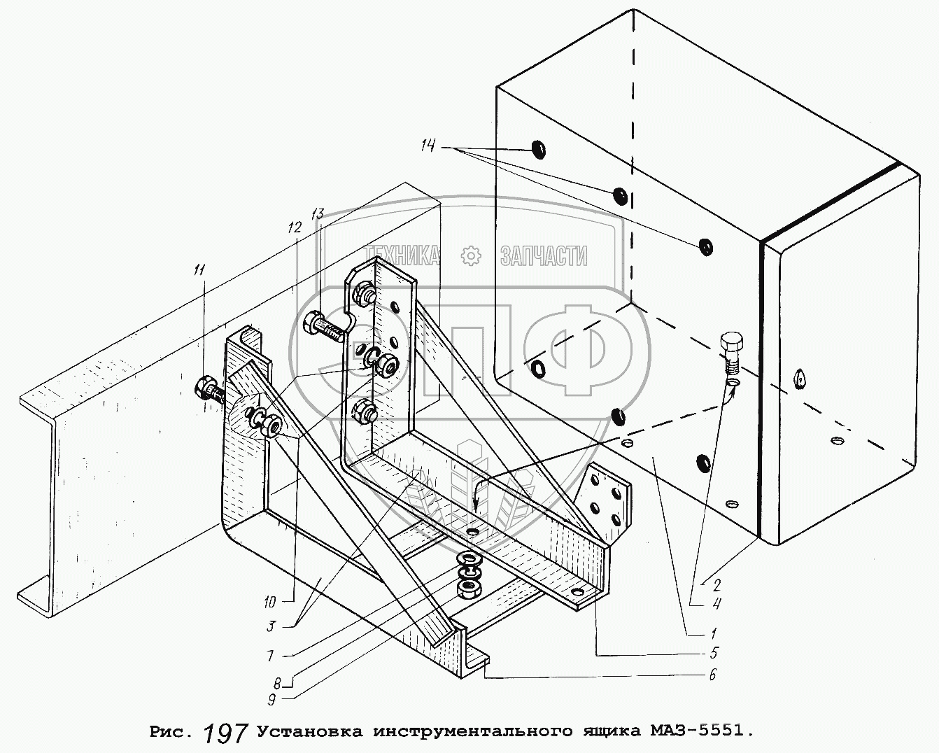 Каталог запасных частей к технике: МАЗ-5551. Установка инструментального ящика МАЗ-5551