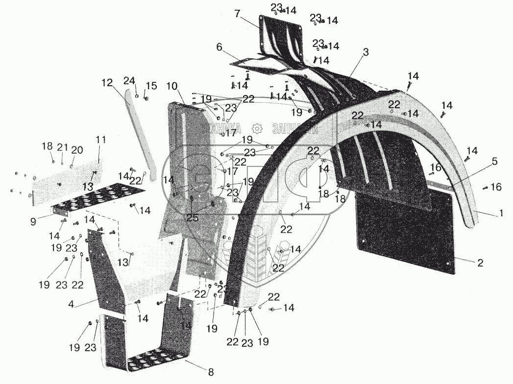 Каталог запасных частей к технике: МАЗ-6422. Установка оперения на малую кабину