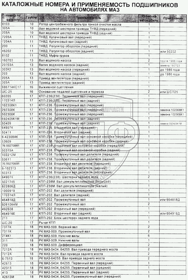 Каталог запасных частей к технике: МАЗ Справочник. Каталожные номера и применяемость подшипников