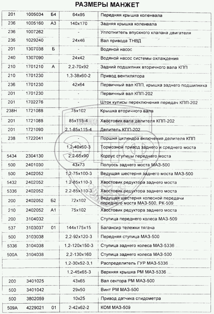 Каталог запасных частей к технике: МАЗ Справочник. Размеры манжет