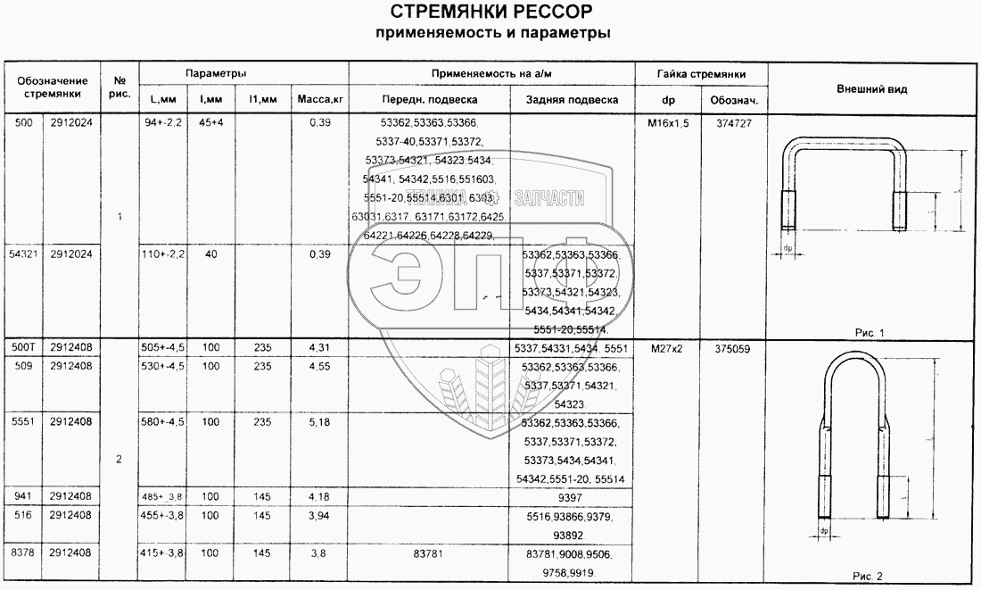 Каталог запасных частей к технике: МАЗ Справочник. Стремянки рессор. Применяемость и параметры