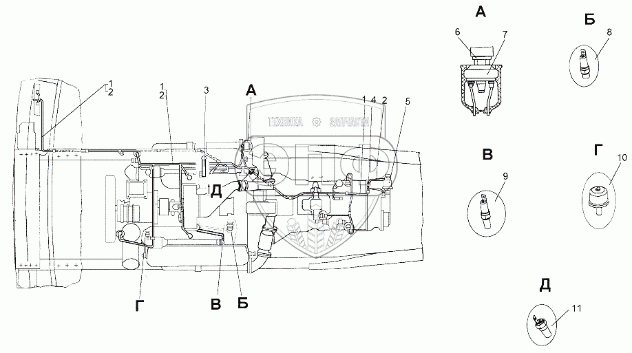 Каталог запасных частей к технике: МЗКТ-65151 "Волат". Установка электрооборудования двигателя