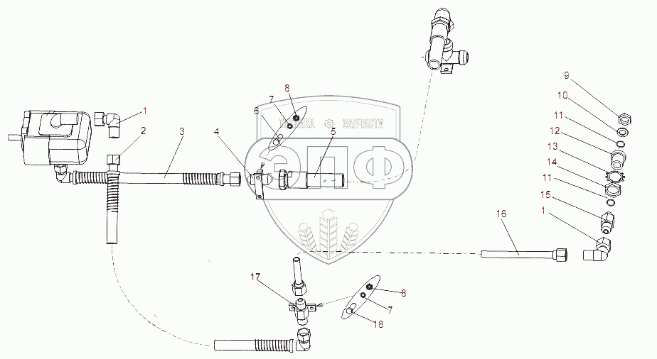 Каталог запасных частей к технике: МЗКТ-65151 "Волат". Установка трубопроводов насоса