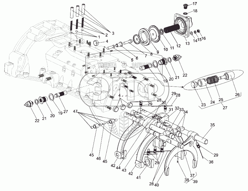 Каталог запасных частей к технике: МЗКТ-65151 "Волат". Установка вилок переключения передач