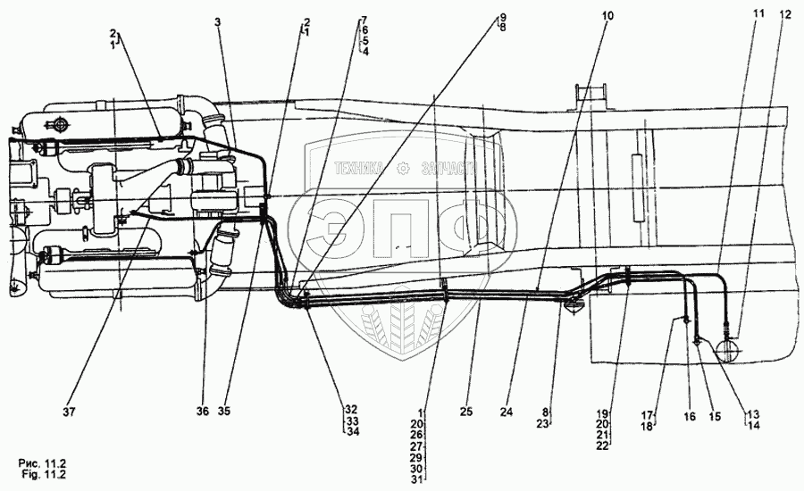 Каталог запасных частей к технике: МЗКТ-65158. Установка топливопроводов
