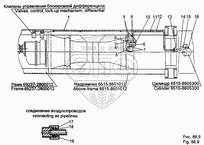 Каталог запасных частей к технике: МЗКТ-65158. Установка трубопроводов системы управления