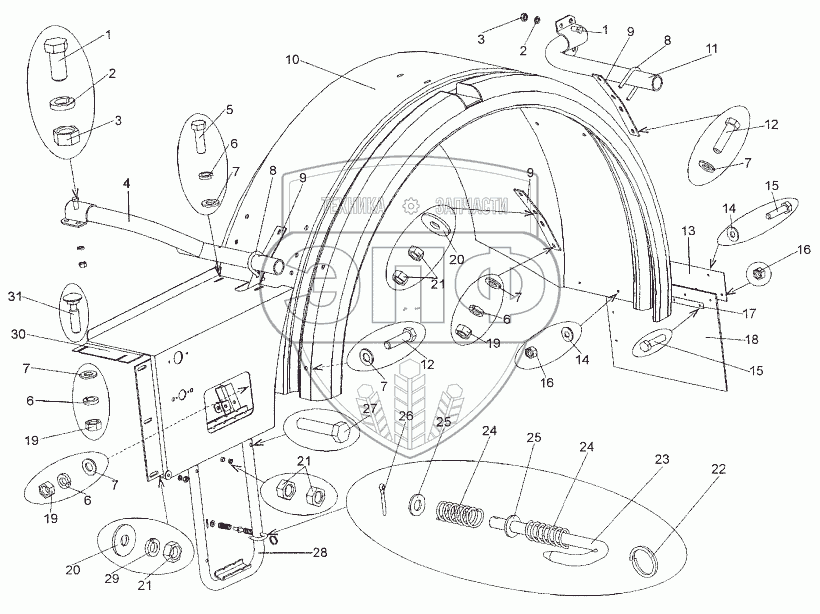 Каталог запасных частей к технике: МЗКТ-652511. Установка передних крыльев