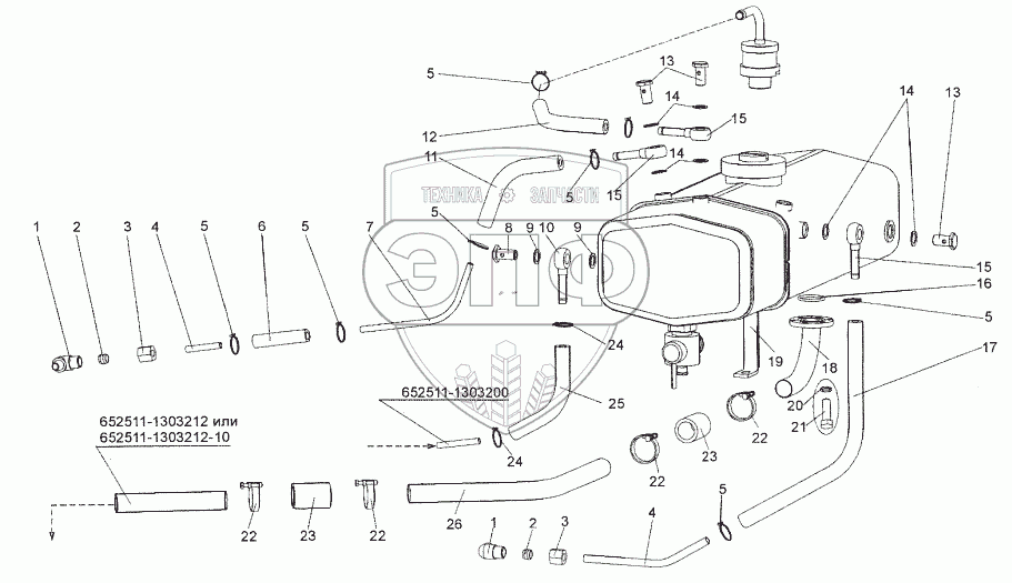 Каталог запасных частей к технике: МЗКТ-652511. Установка трубопроводов бачка расширительного