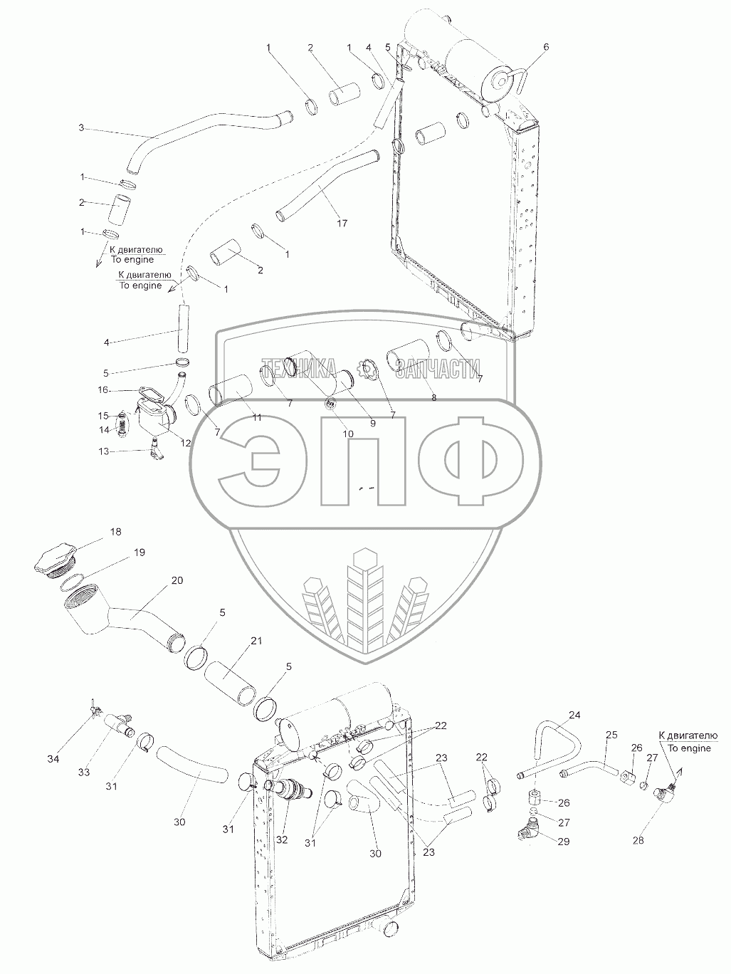 Каталог запасных частей к технике: МЗКТ-7402. Установка трубопроводов системы охлаждения двигателя