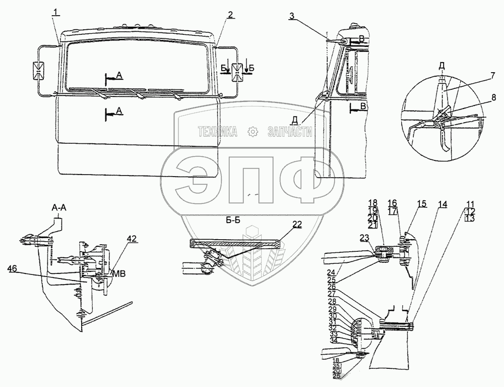 Каталог запасных частей к технике: МЗКТ-79092. Установка стеклоочистителя, зеркал, антенны