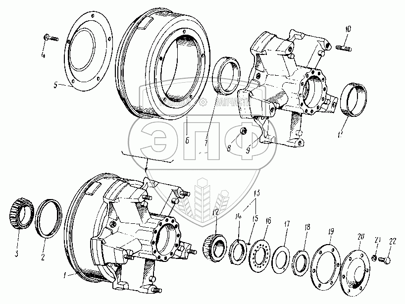 Каталог запасных частей к технике: Нефтекамский автозавод 8527. Ступица с тормозным барабаном