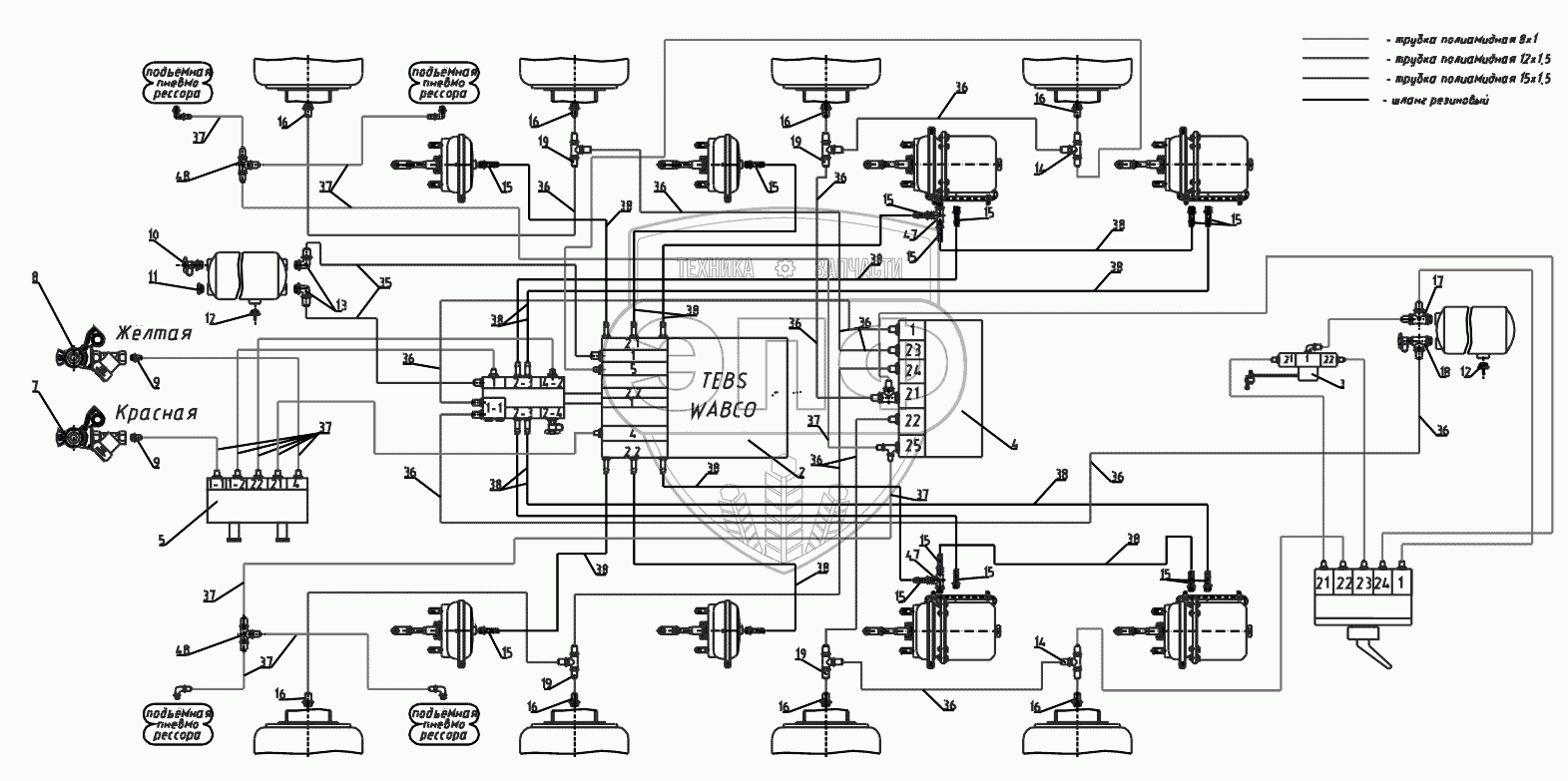Каталог запасных частей к технике: Тонар-95234. Схема пневматическая Wabco