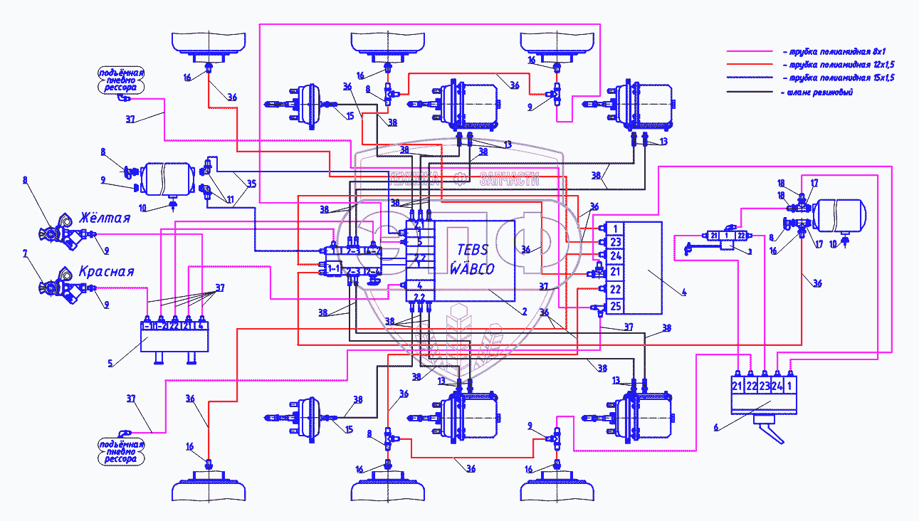 Каталог запасных частей к технике: Тонар-9523 (вариант). Схема пневматическая WABCO
