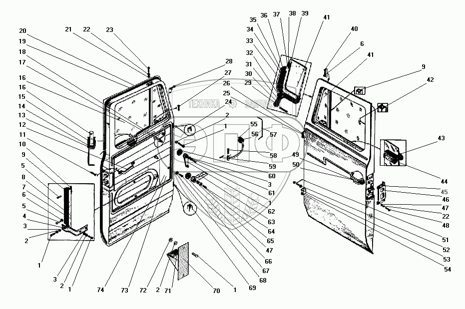 Каталог запасных частей к технике: УралАЗ УРАЛ-43203-10. Двери кабины
