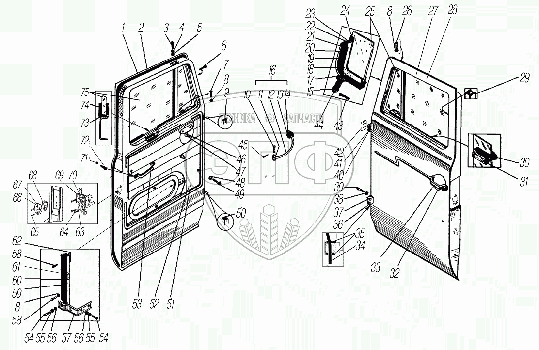 Каталог запасных частей к технике: УралАЗ УРАЛ-43204-1153-70. Двери кабины