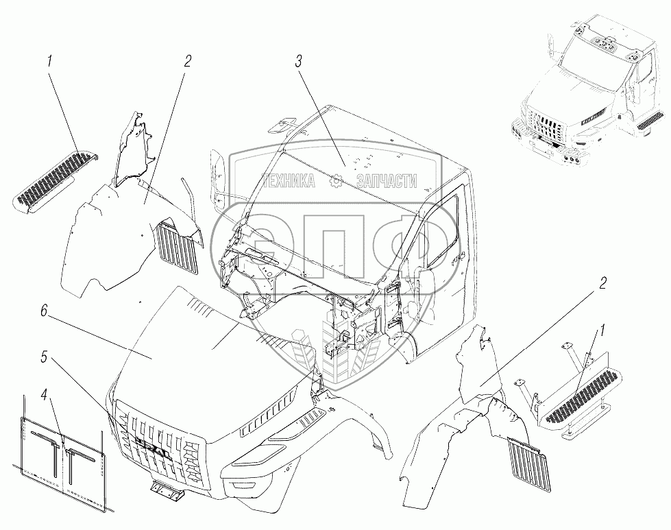 Каталог запасных частей к технике: УралАЗ УРАЛ-4320-6951-74. Кабина и оперение