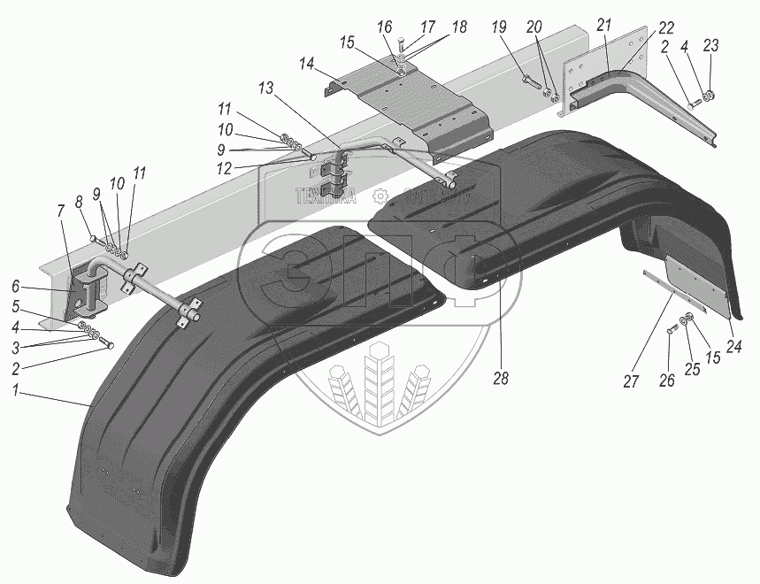 Каталог запасных частей к технике: УралАЗ УРАЛ-44202-3511-80. Установка задних крыльев