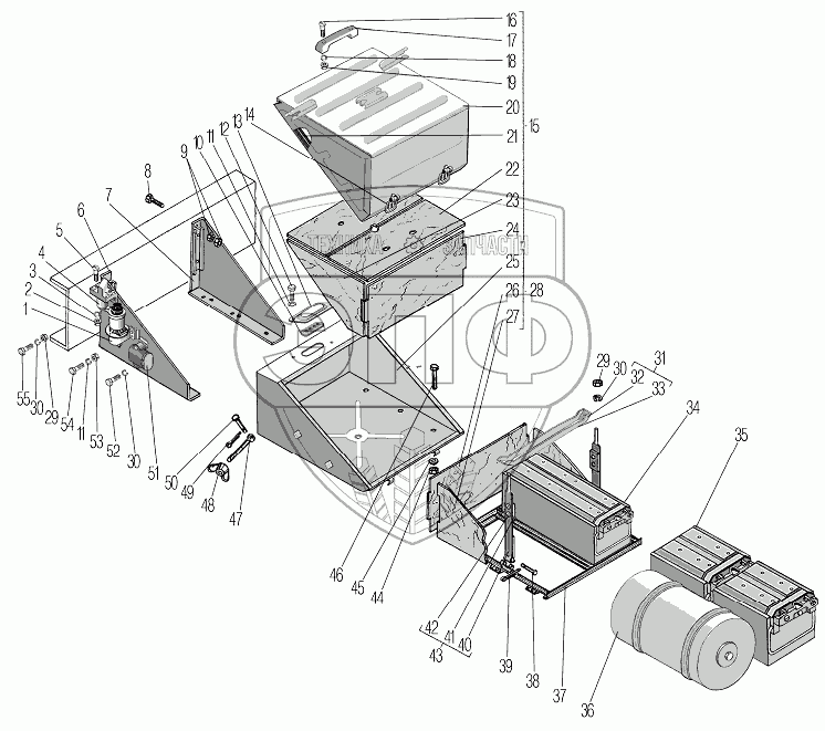 Каталог запасных частей к технике: УралАЗ УРАЛ-532361. Установка контейнера аккумуляторных батарей
