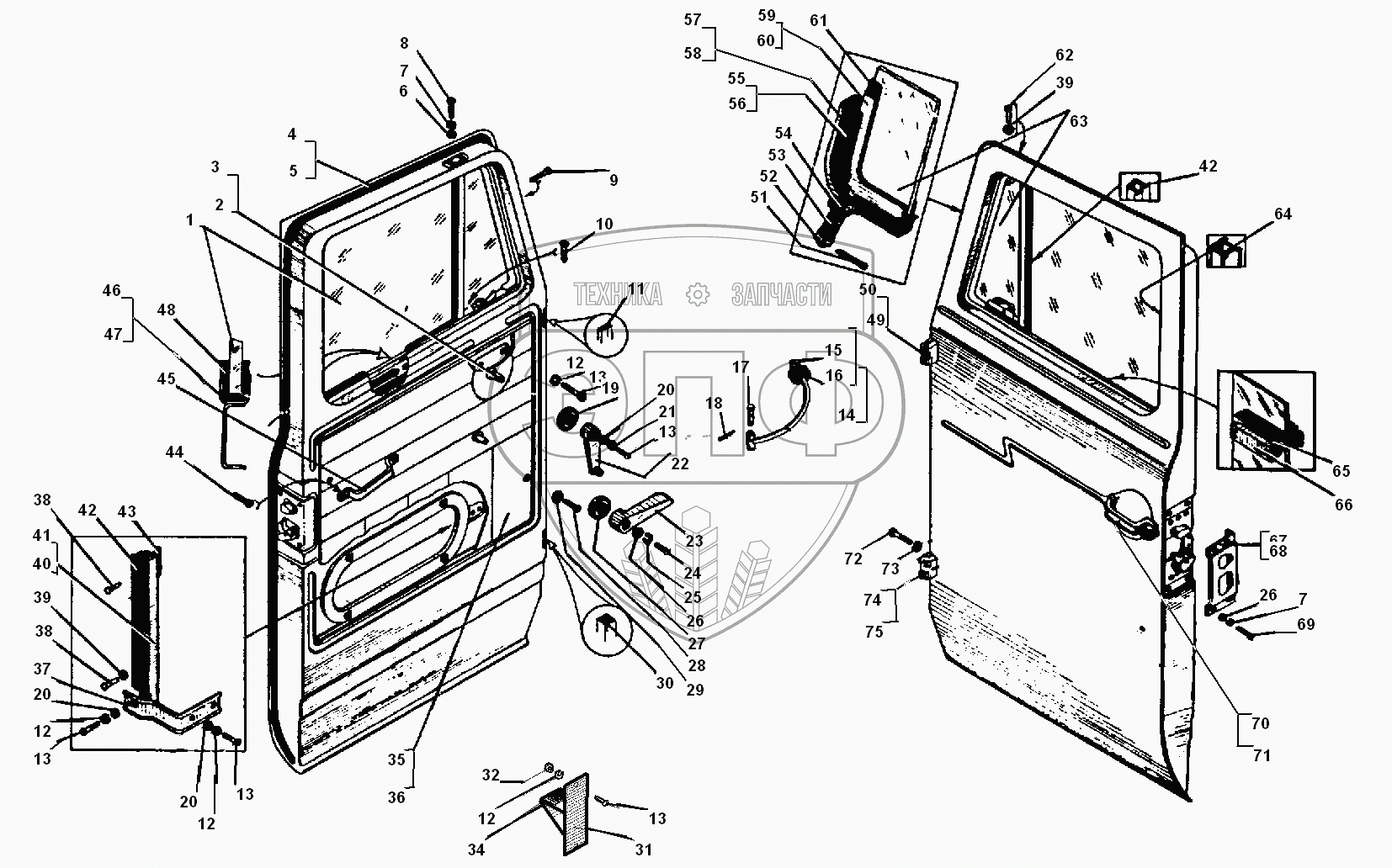 Каталог запасных частей к технике: УралАЗ УРАЛ-55571-30. Двери кабины