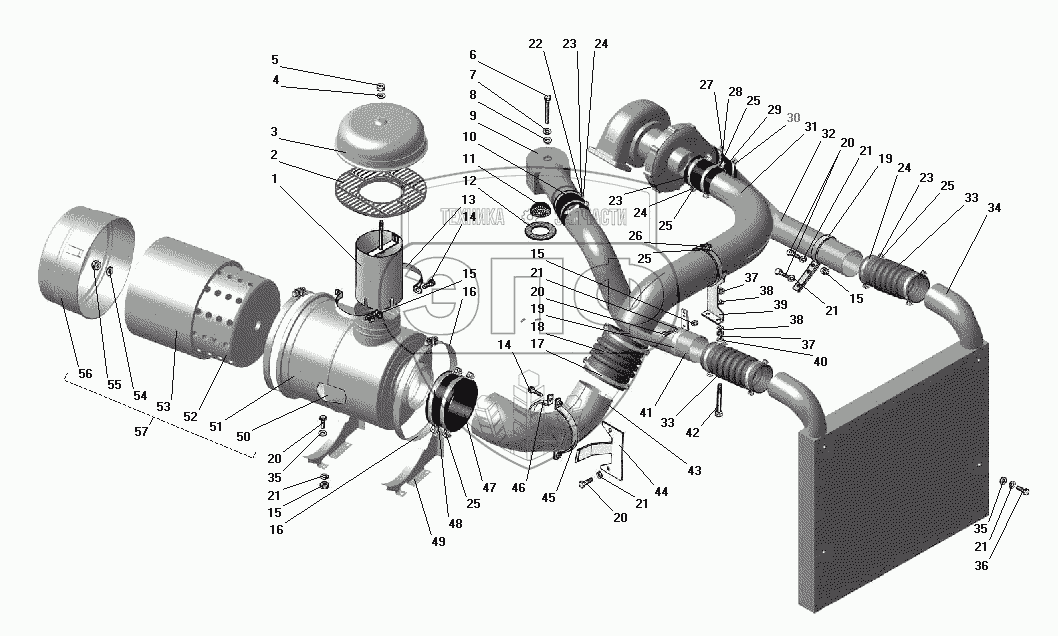 Каталог запасных частей к технике: УралАЗ УРАЛ-55571-40. Воздухопровод с воздушным фильтром