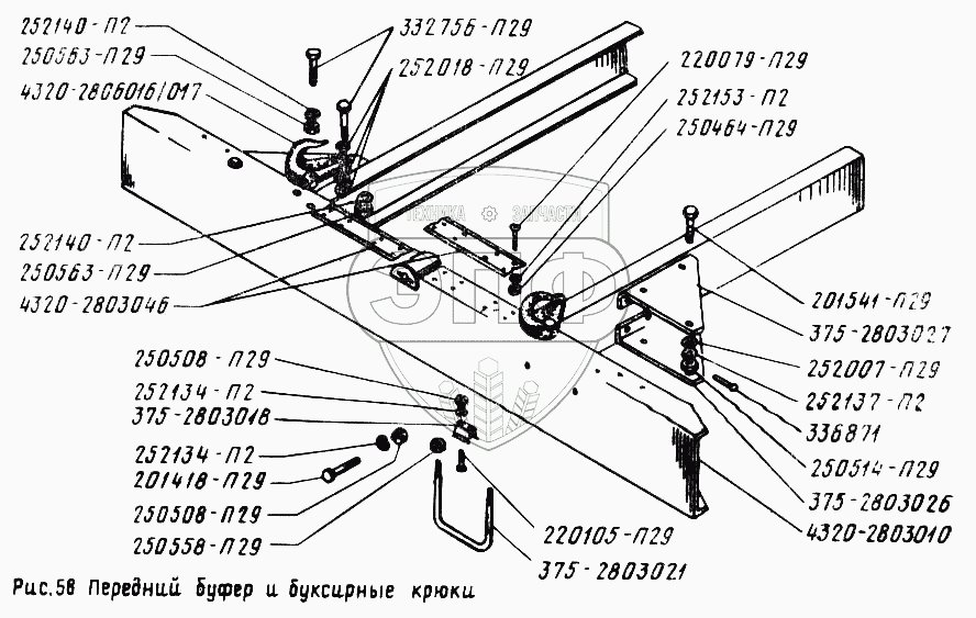 Каталог запасных частей к технике: УралАЗ УРАЛ-5557. Передний буфер и буксирные крюки
