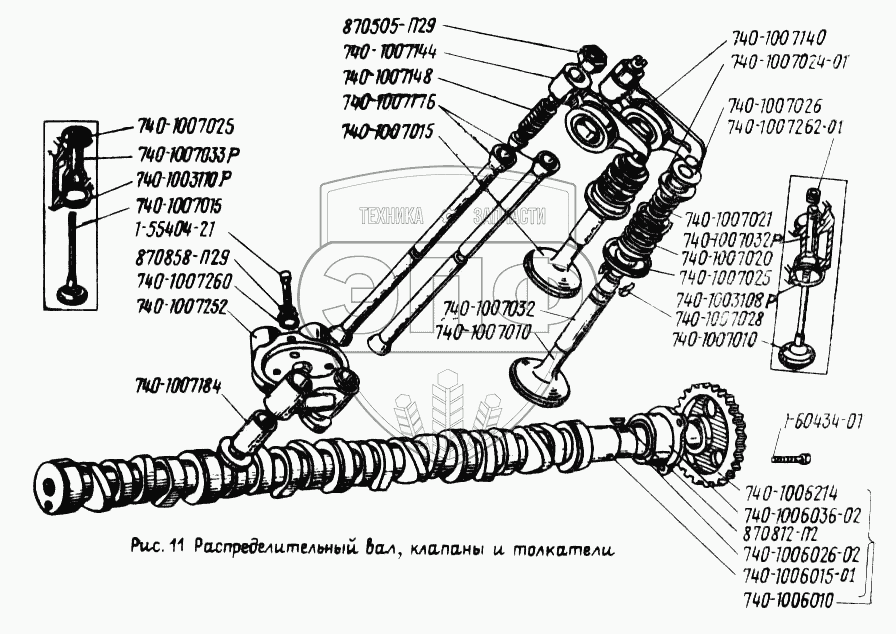 Каталог запасных частей к технике: УралАЗ УРАЛ-5557. Распределительный вал, клапаны и толкатели