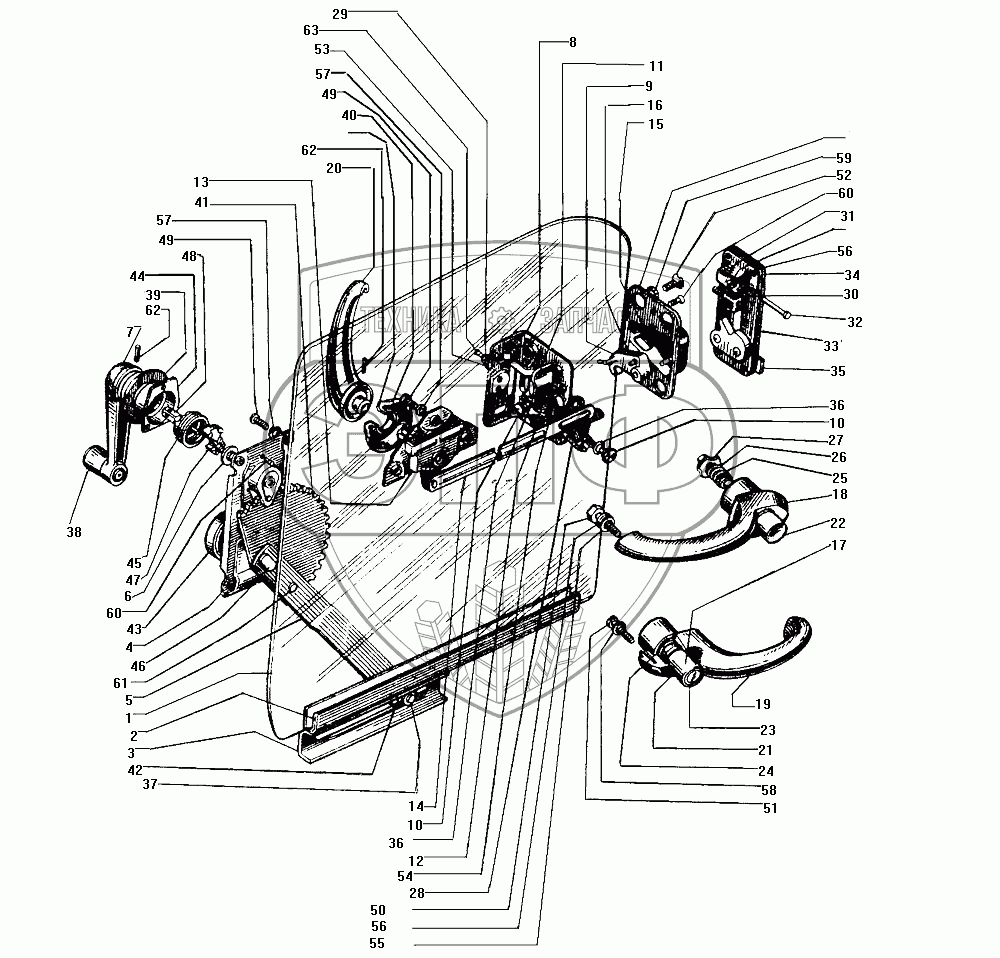Каталог запасных частей к технике: ЗИЛ-130. Замок, ручки и стеклоподъемник двери