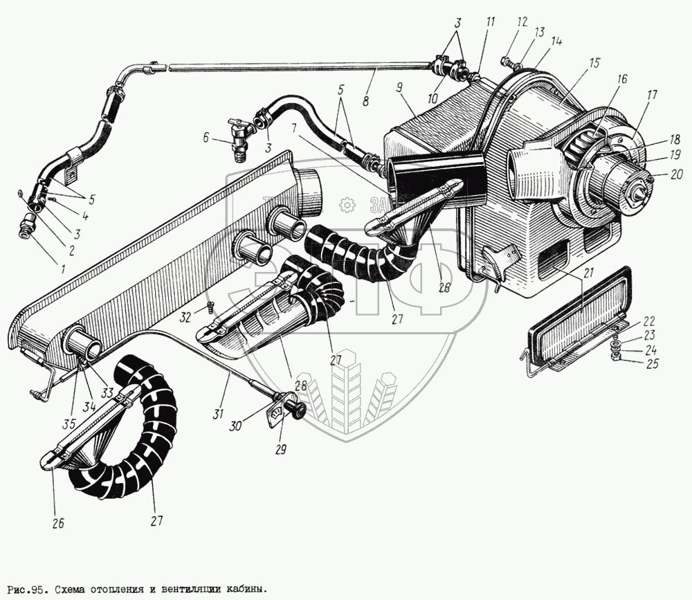 Каталог запасных частей к технике: ЗИЛ-131. Схема отопления и вентиляции кабины