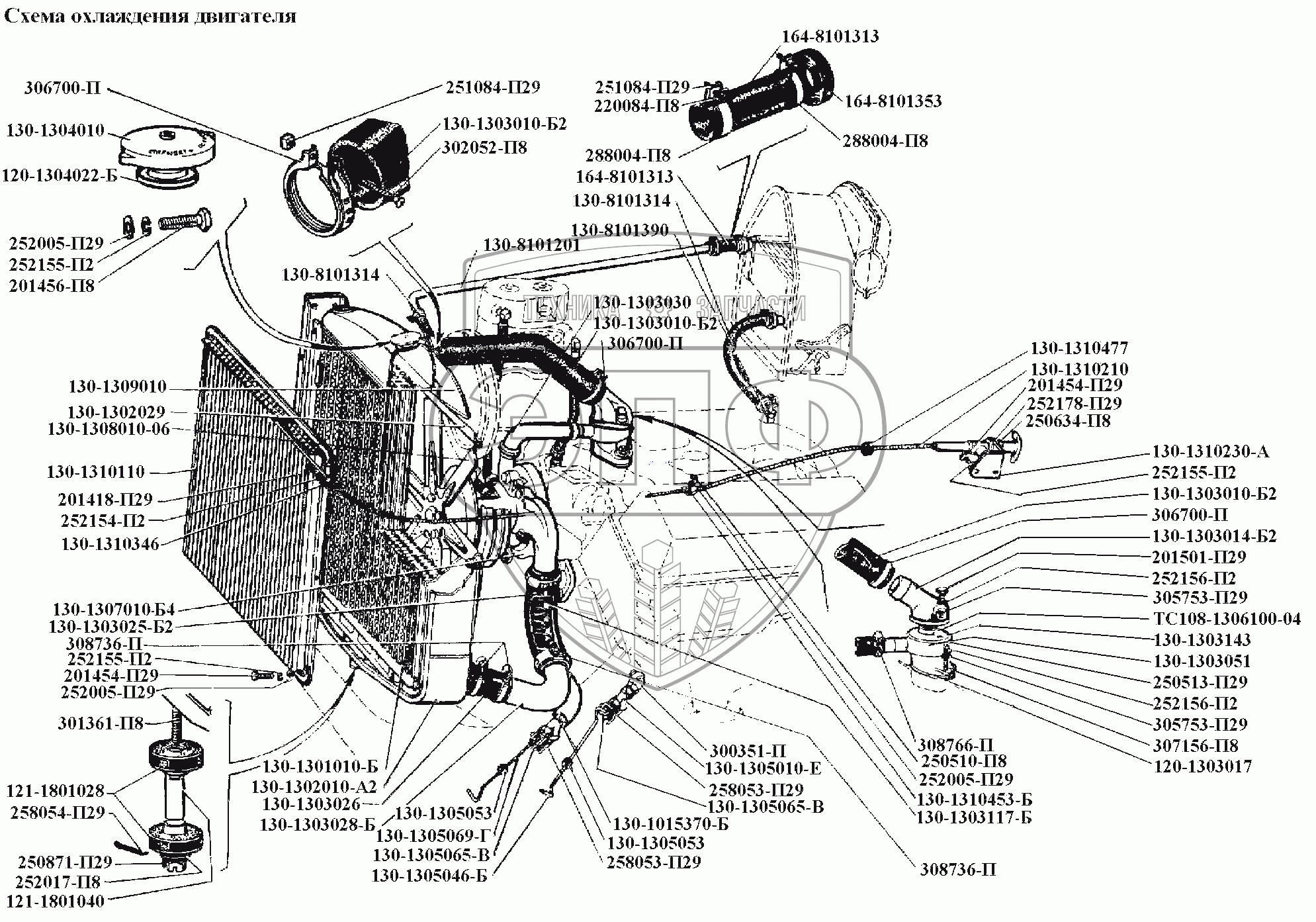 Каталог запасных частей к технике: ЗИЛ-431416. Система охлаждения\Схема охлаждения двигателя