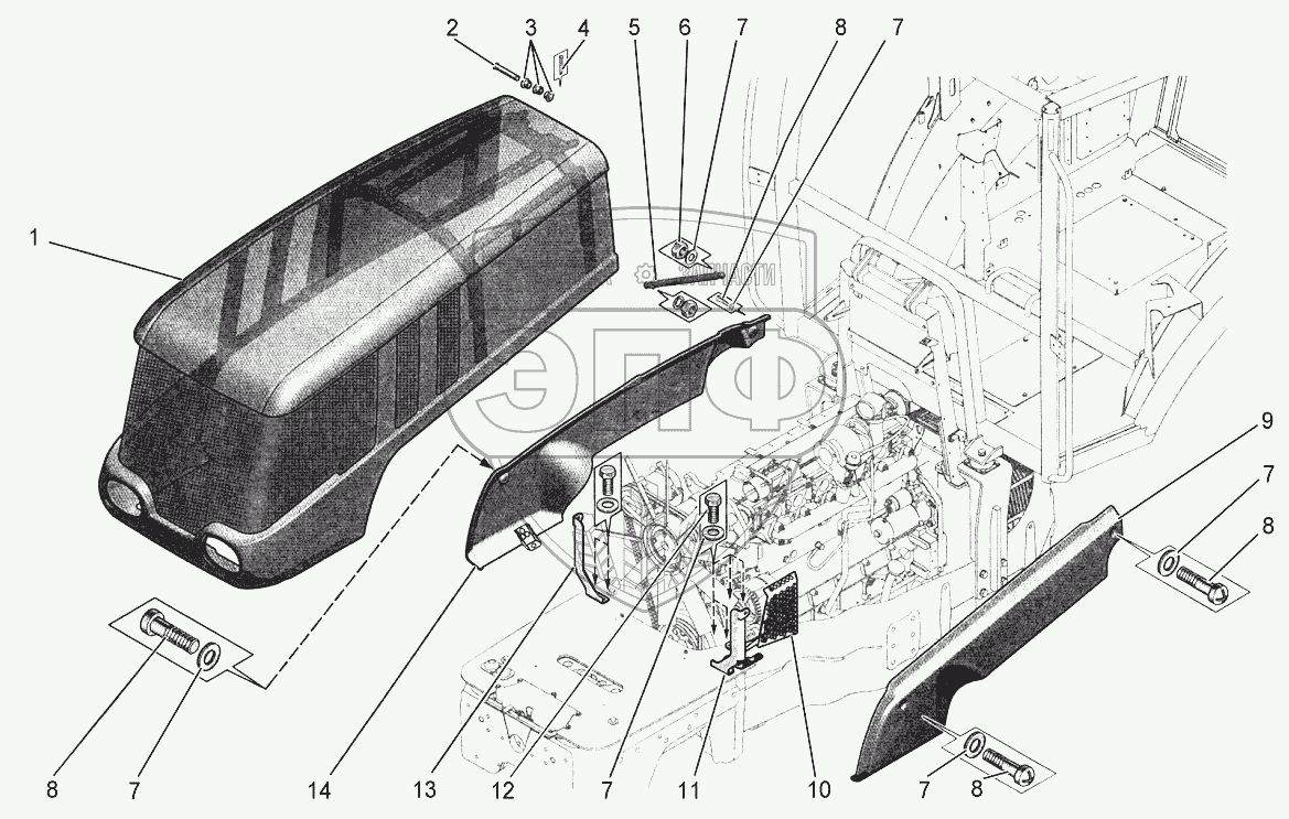 Каталог запасных частей к технике: Агротехмаш АТМ-5280. Установка капота и кожухов