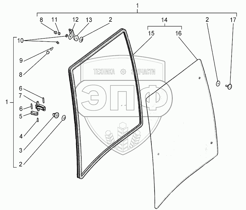 Каталог запасных частей к технике: Агротехмаш АТМ-5280. Установка стекла заднего левого