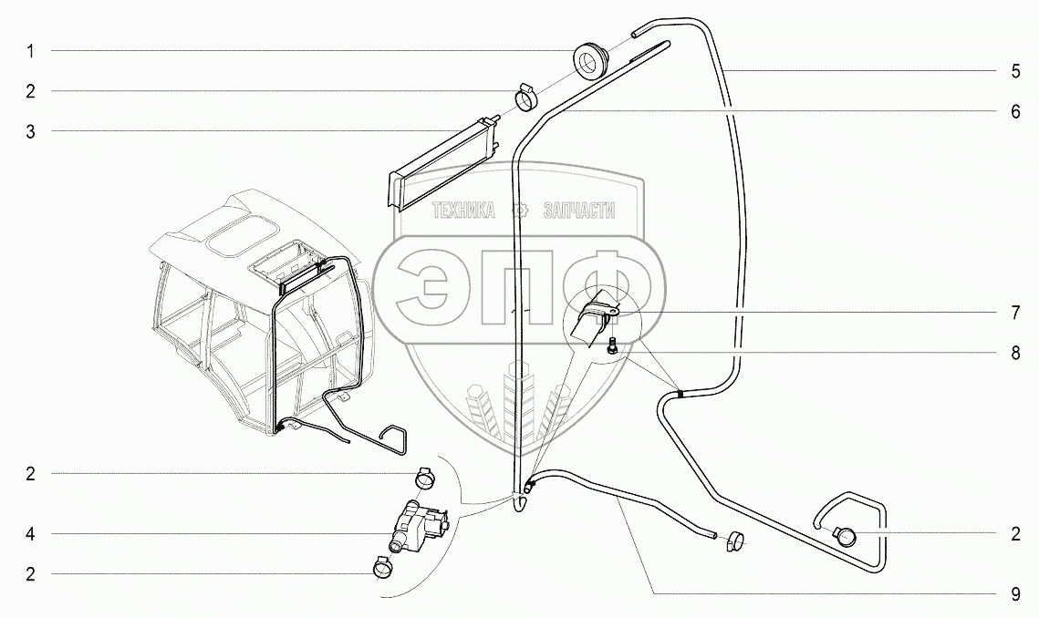 Каталог запасных частей к технике: Агротехмаш АТМ-7360. A610 Радиатор отопителя кабины, трубопроводы