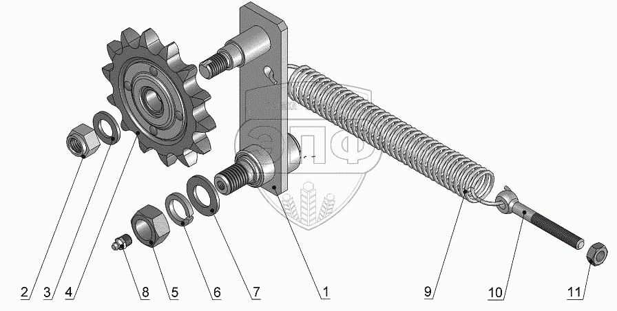 Каталог запасных частей к технике: Бобруйскагромаш ПРЛ-150. Натяжник в сборе