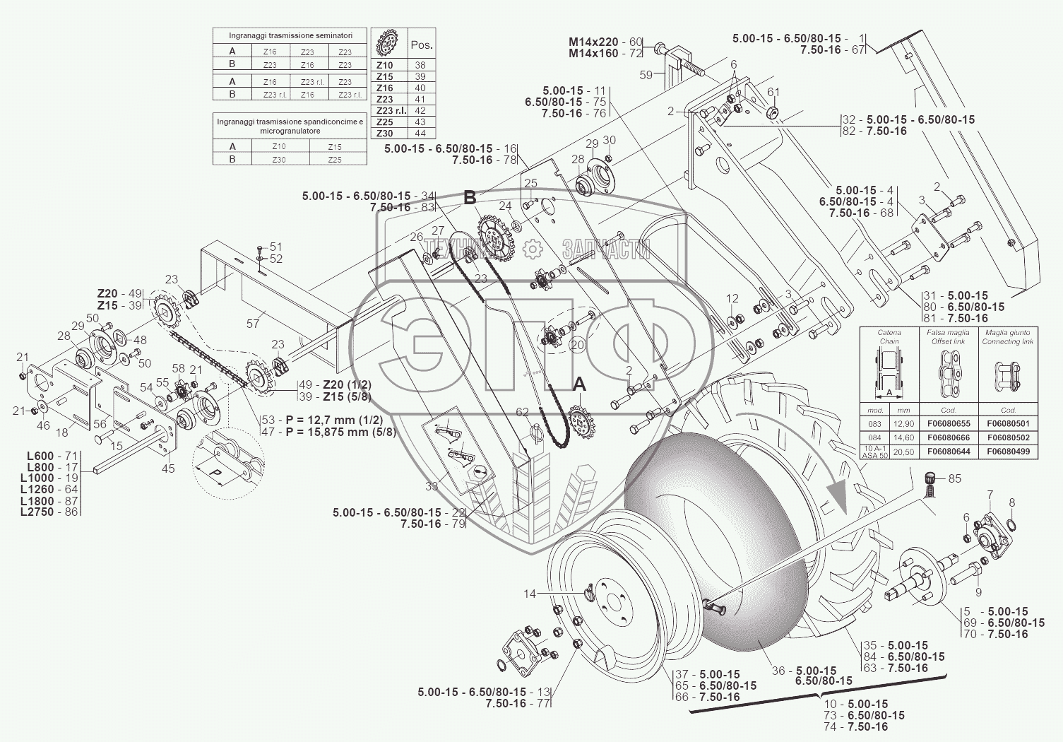 Каталог запасных частей к технике: Gaspardo Сеялка Gaspardo MTR. FRONT TRANSMISSION WHEELS