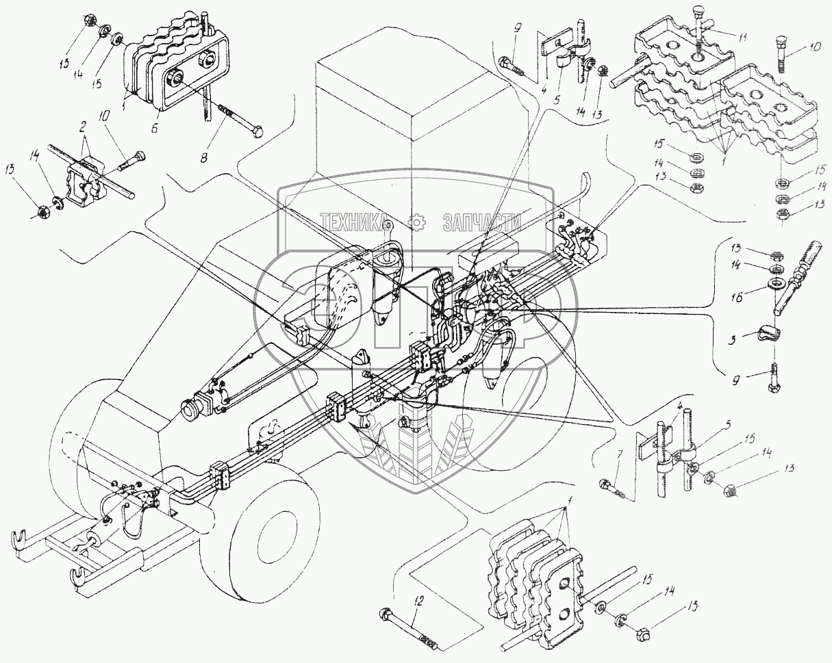 Каталог запасных частей к технике: Гомсельмаш УЭС Полесье-250. Крепление узлов гидрооборудования