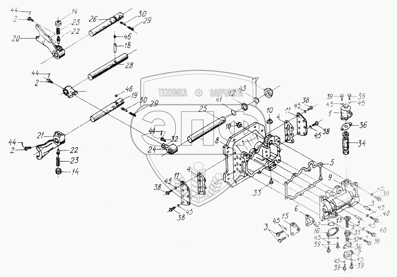 Каталог запасных частей к технике: Гомсельмаш УЭС Полесье-250. Механизм переключения диапазонов 3518020-46160