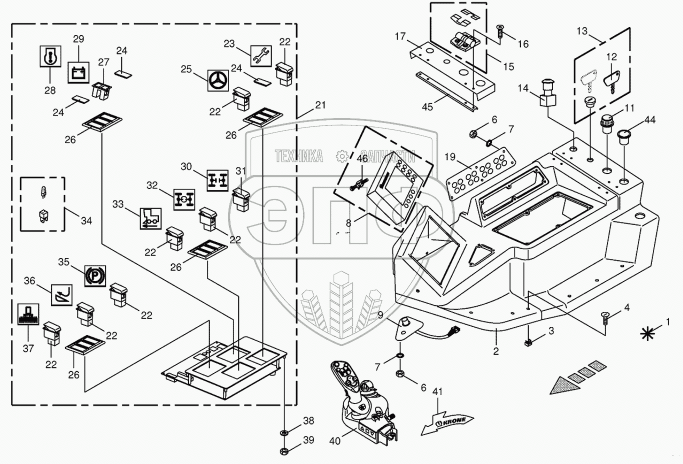 Каталог запасных частей к технике: KRONE BIG-X-500. Control box mounting parts-top