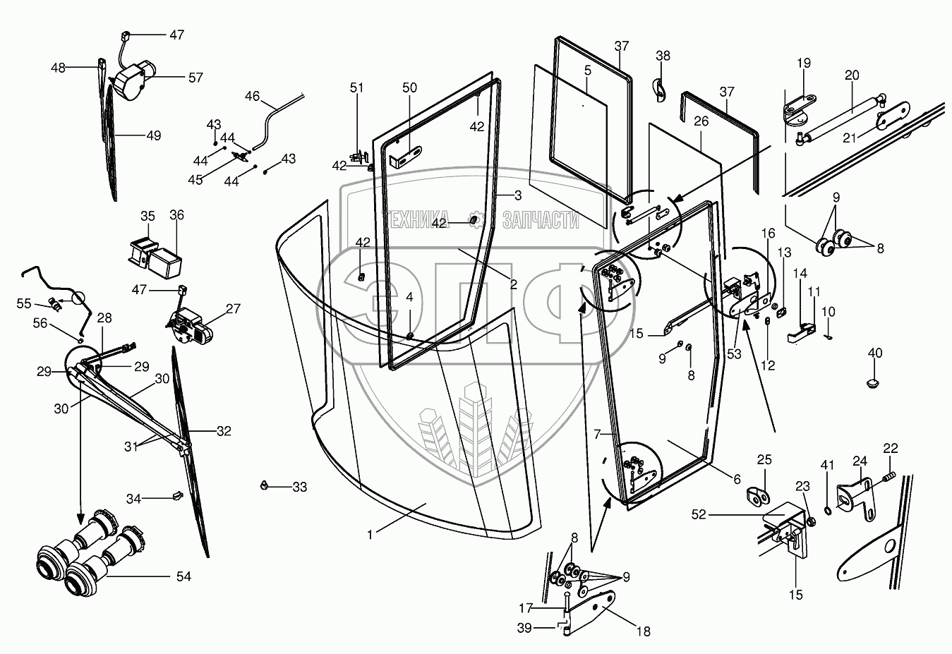 Каталог запасных частей к технике: KRONE BIG-X-V8/BIG-X-V12. Cab - glazing