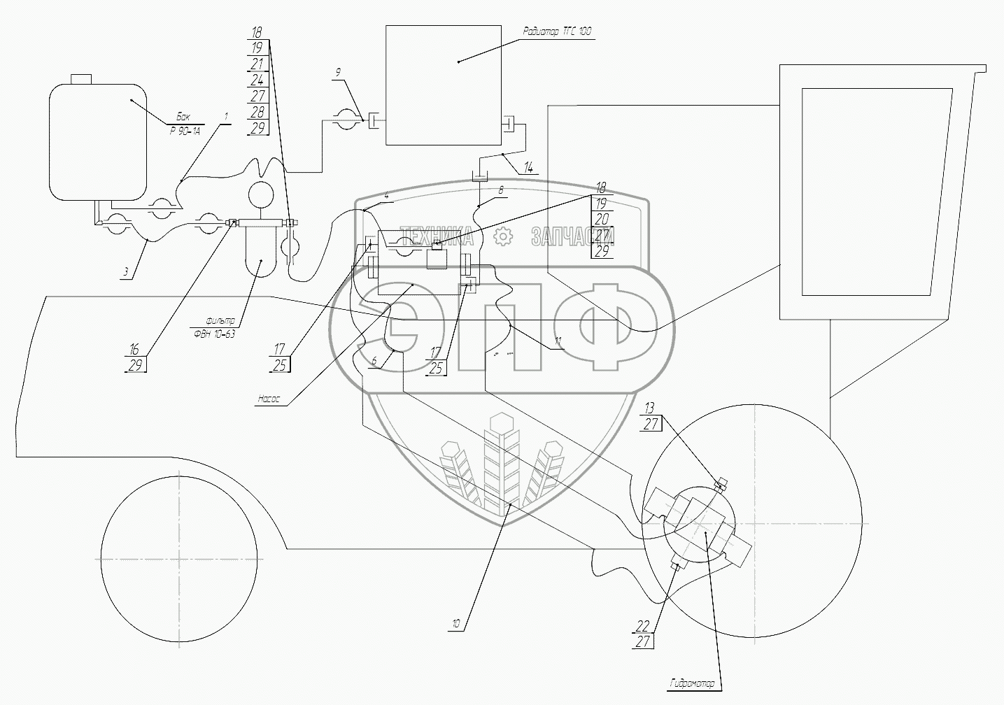 Каталог запасных частей к технике: КЗК Енисей КЗС-950. Гидросистема привода хода Р90