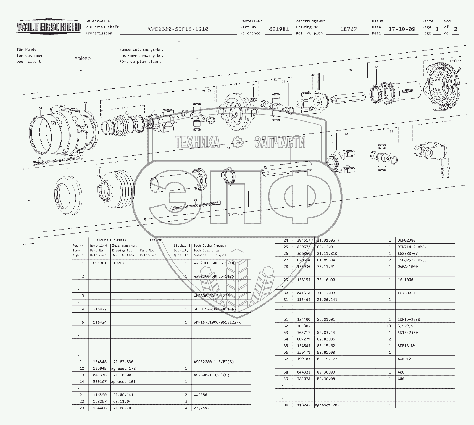 Каталог запасных частей к технике: Lemken Primus 10 (Часть 1). R001127 Cardan shaft
