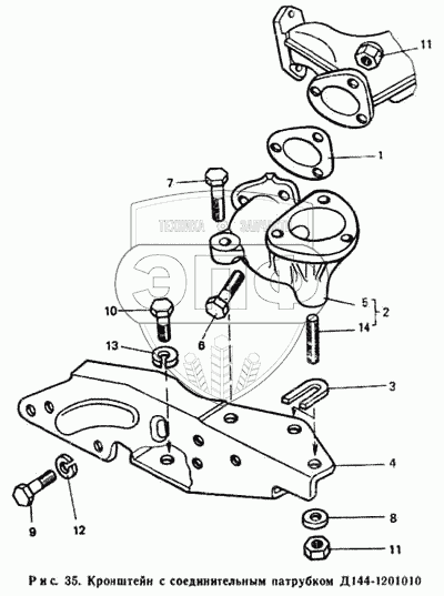 Каталог запасных частей к технике: ЛТЗ Т-40М. Кронштейн с соединительным патрубком Д144-1201010