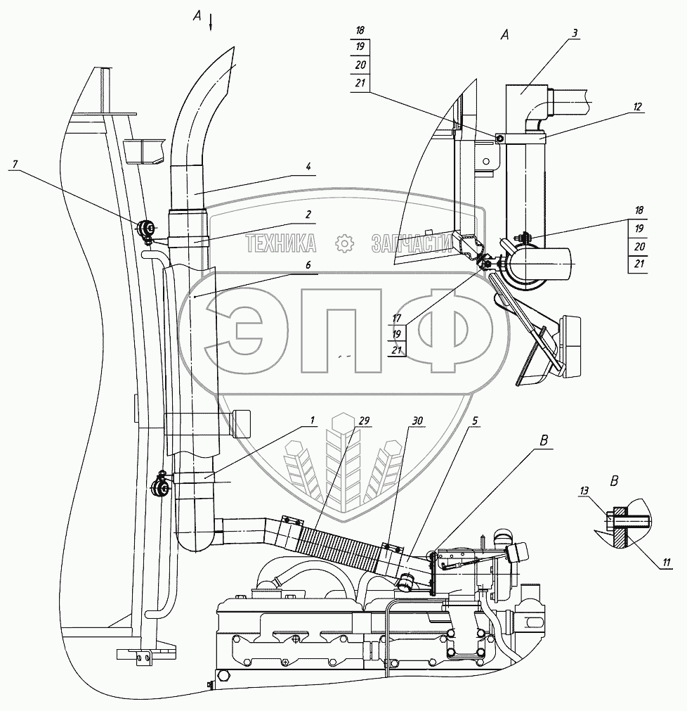 Каталог запасных частей к технике: МТЗ 2122.3/2122.4. Установка глушителя