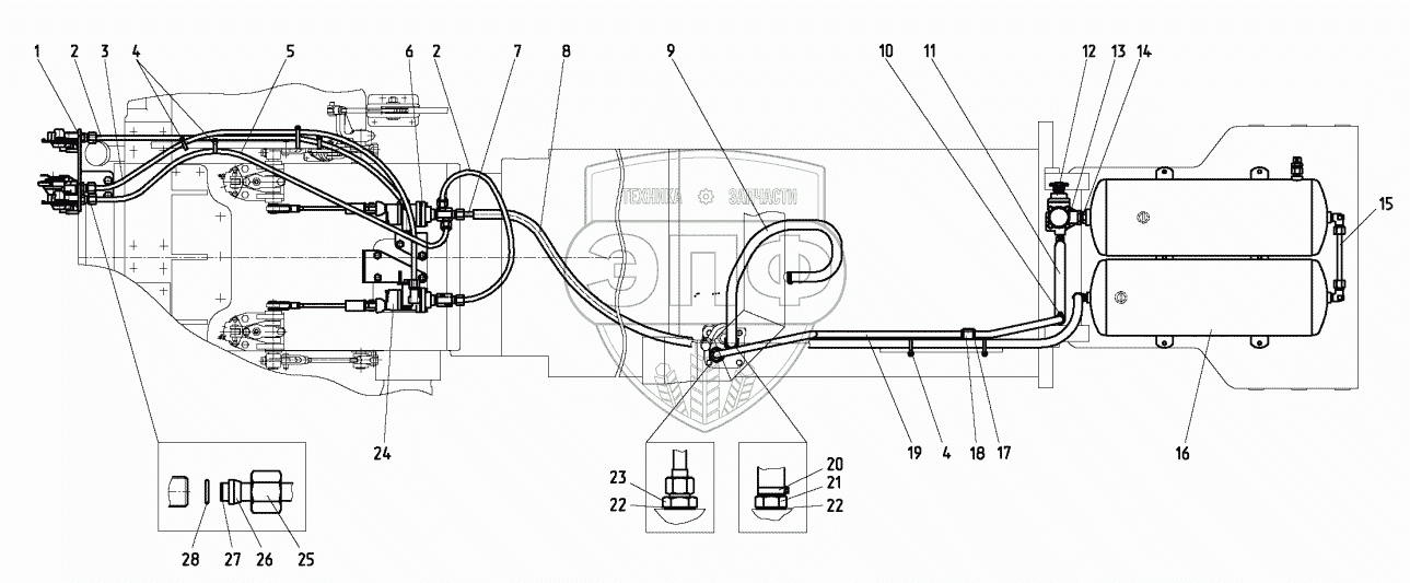 Каталог запасных частей к технике: МТЗ-3522. Пневмопривод тормозов прицепа (комбинированный)