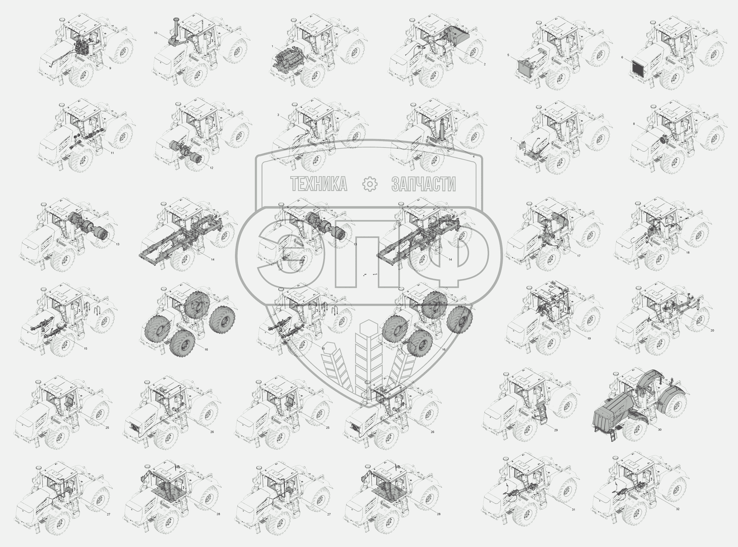 Каталог запасных частей к технике: ПТЗ К-744Р1 "Стандарт". Схема деления трактора