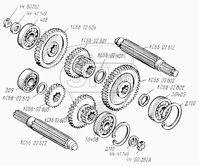 Каталог запасных частей к технике: ТКЗ КС-6Б. Редуктор диапазонов. Валы, шестерни