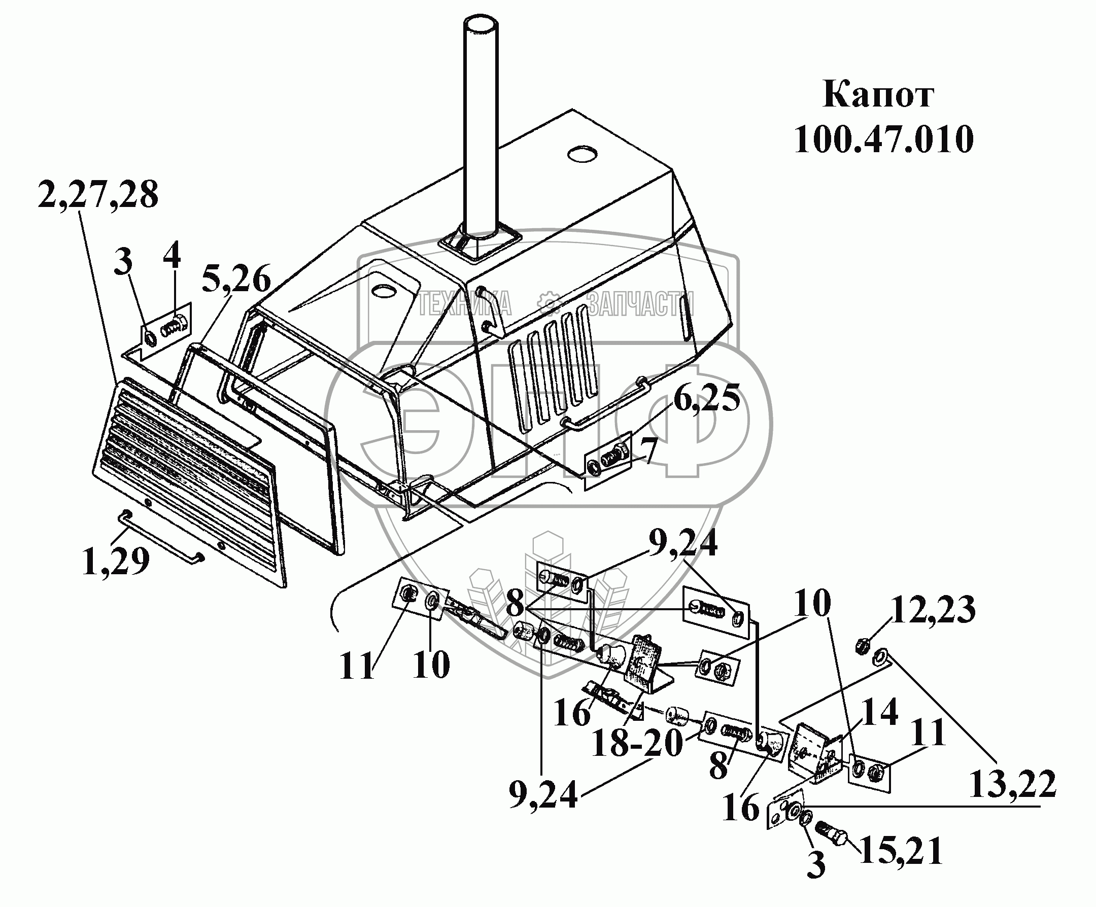 Каталог запасных частей к технике: ВгТЗ ВТ-100Д. Капот 100.47.010 (1)