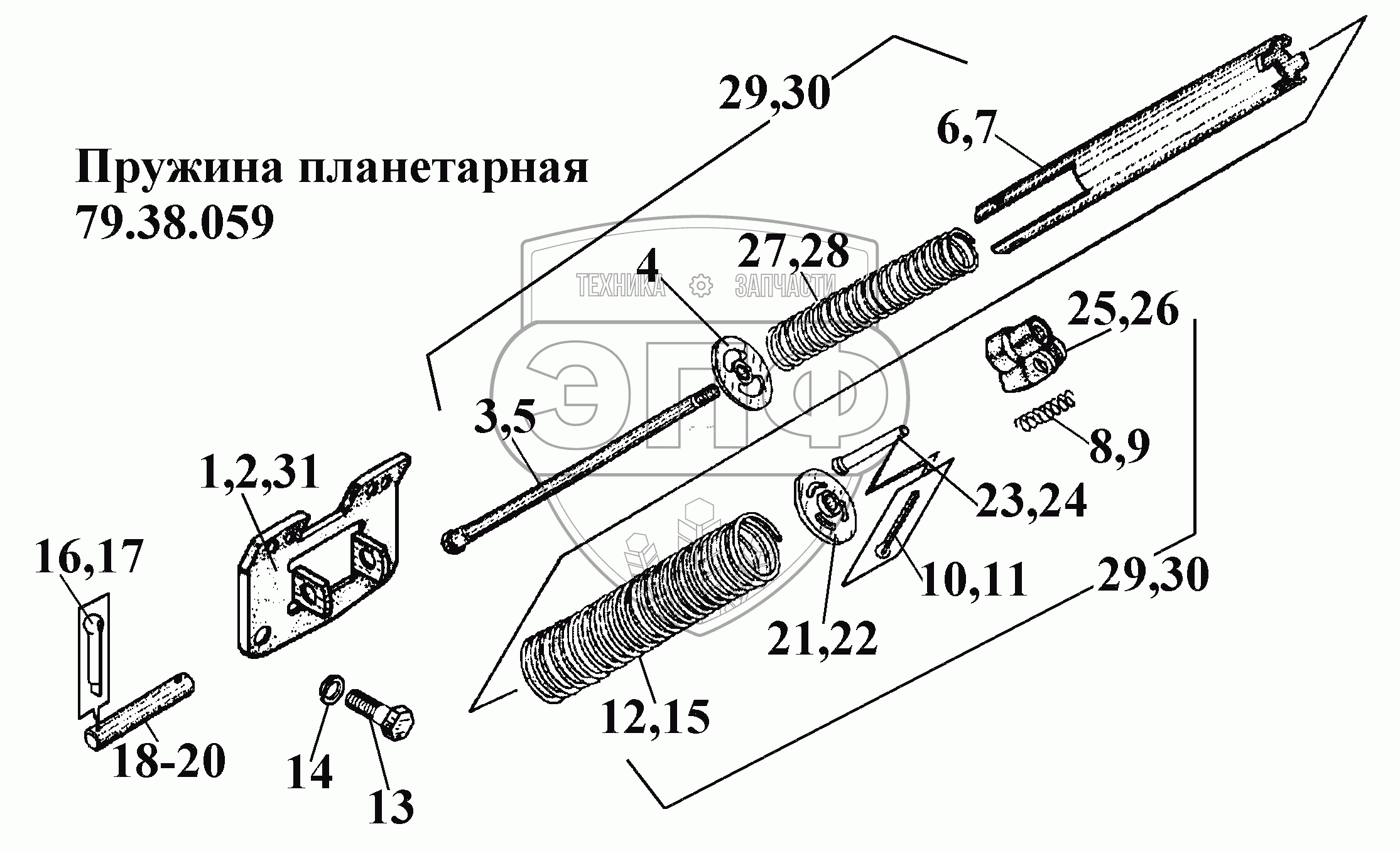 Каталог запасных частей к технике: ВгТЗ ВТ-100Д. Пружина планетарная 79.38.059