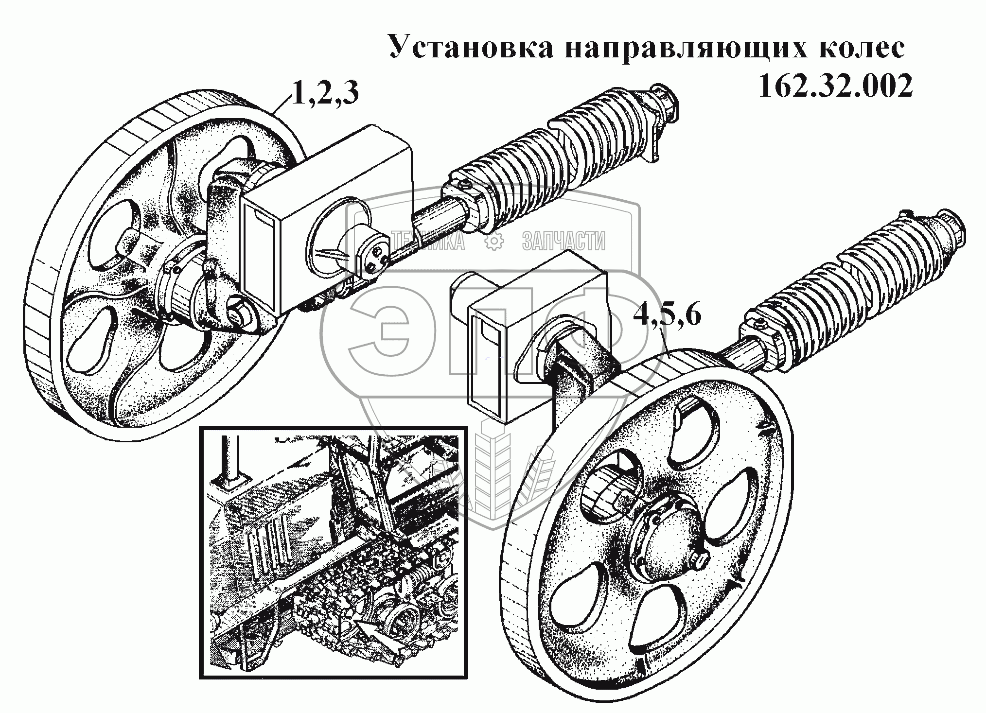 Каталог запасных частей к технике: ВгТЗ ВТ-100Д. Установка направляющих колес 162.32.002